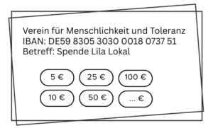 Werde Teil des Lila Lokal Soli-Kreises und untertstütze uns mit einer monatlichen Spende! Richte dafür einen Dauerauftrag auf folgendem Konto ein: